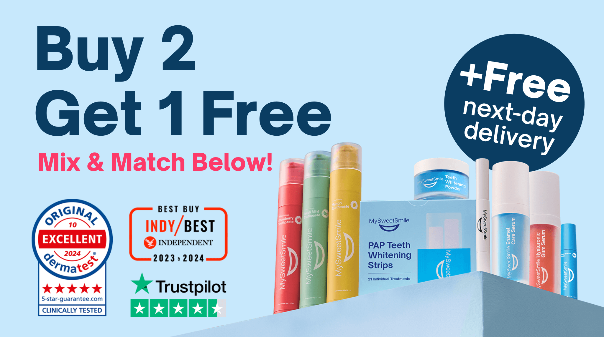 Trusted by over 1 million customers worldwide, MySweetSmile is the #1 Teeth Whitening Brand, awarded Best-Buy by The Independent two years in a row and rated Excellent on Trustpilot.